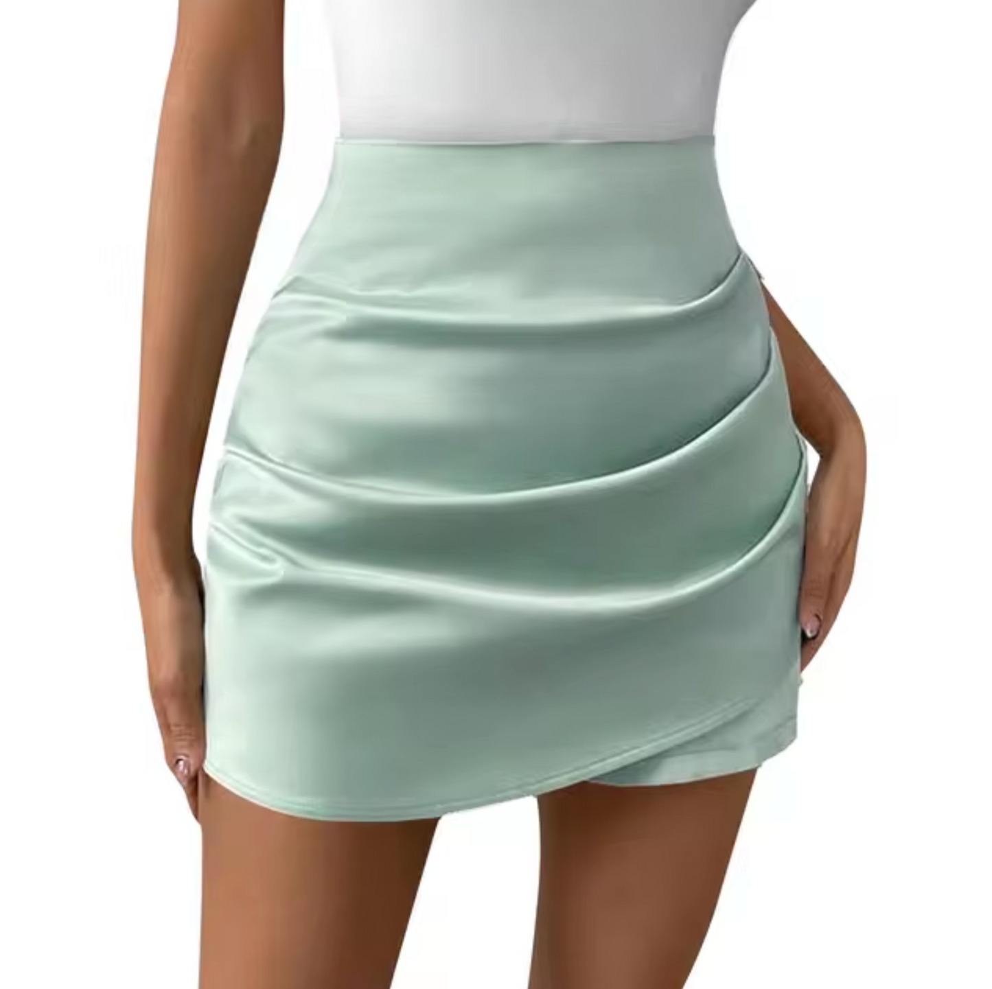 Añade un toque de glamour a tu vestuario con esta elegante minifalda de satén que te convertirá en el centro de todas las miradas. Gracias a su superficie lisa y brillante, esta falda se adapta perfectamente al cuerpo y aporta un toque lujoso a cualquier conjunto. El diseño envolvente asimétrico realza la silueta y la convierte en una opción perfecta tanto para salidas informales como para ocasiones especiales. Esta falda es versátil y puede combinarse fácilmente con una gran variedad de tops y accesorios.