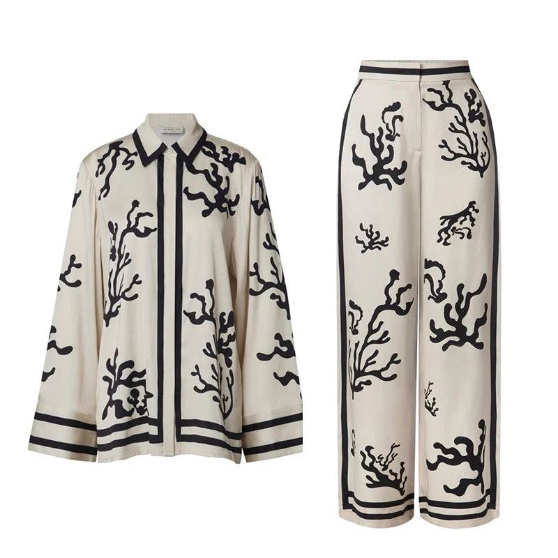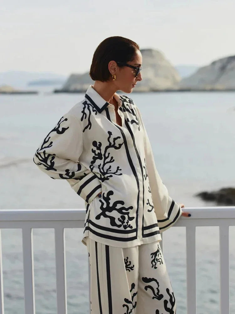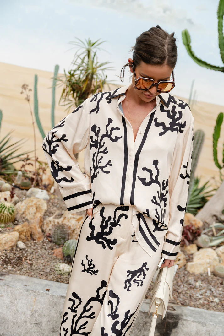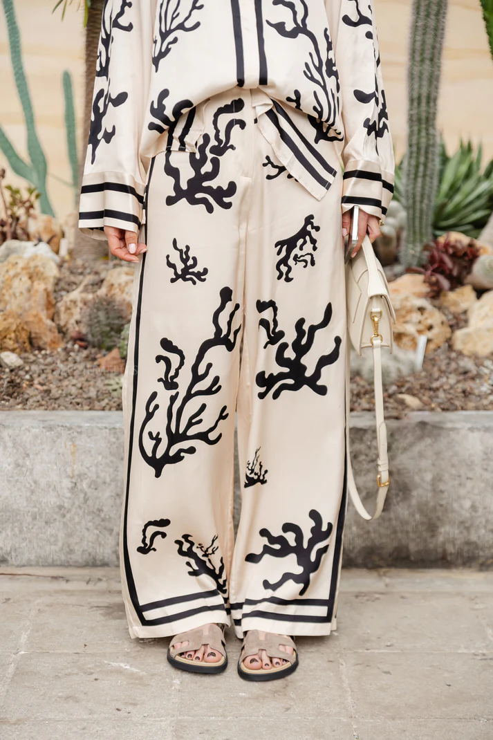 Destaca con el Conjunto de Blusa y Pantalones con Estampado de Coral, una elección perfecta para quienes buscan estilo y confort en su vestuario. Este conjunto presenta una blusa de manga larga con un elegante estampado de coral en negro sobre fondo claro, que aporta un toque de sofisticación y frescura. Los pantalones de pierna ancha complementan perfectamente el conjunto, ofreciendo un ajuste cómodo y un movimiento fluido. Ideal para paseos casuales o eventos especiales, este conjunto garantiza que siempre luzcas chic y a la moda. Combínalo con accesorios minimalistas para un look elegante y sin esfuerzo.