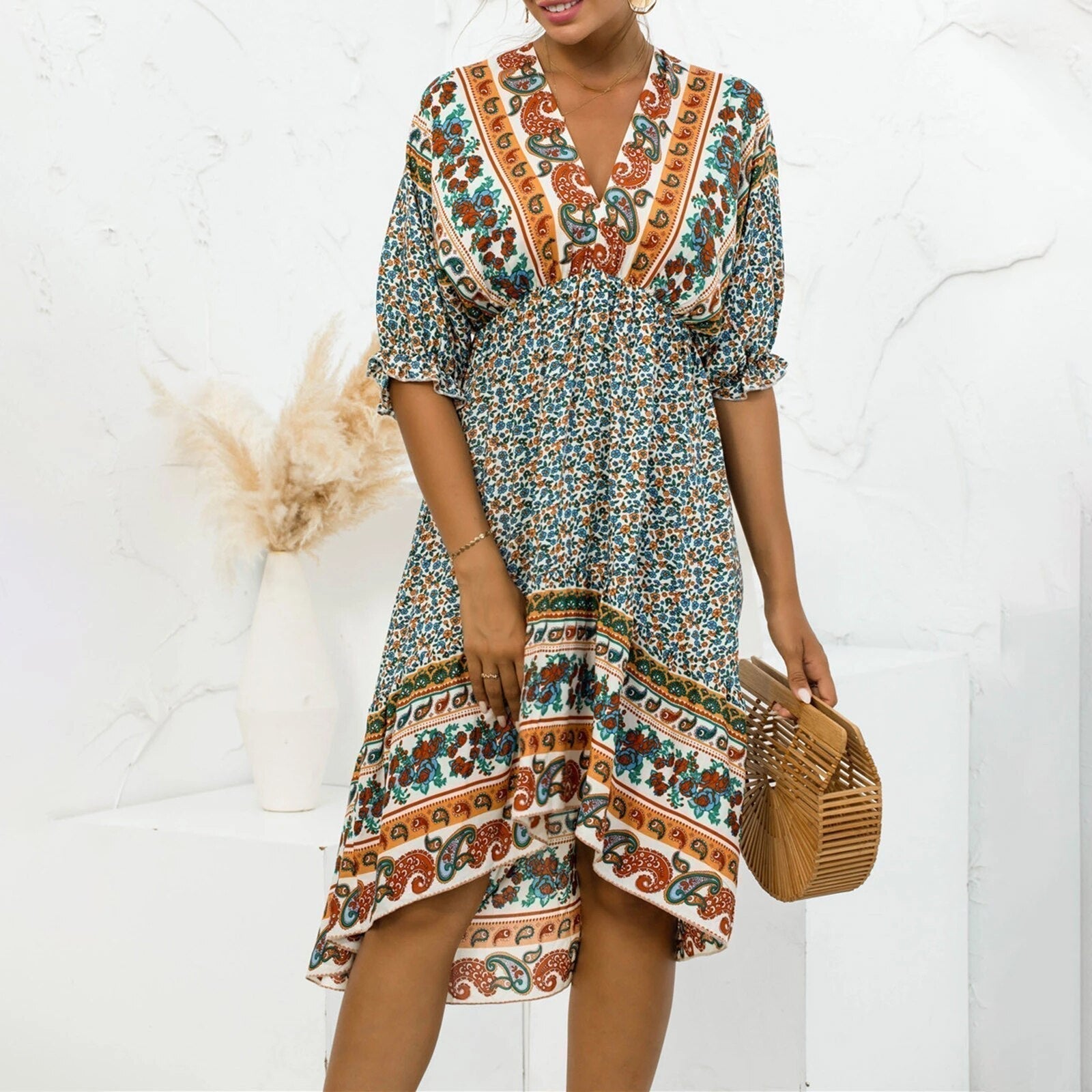 ¿Buscas un vestido que combine elegancia y comodidad? Este Vestido Midi Floral con Escote en V Profundo y Mangas Medias es la mezcla perfecta de gracia y encanto. Con un escote en V llamativo, mangas fluidas y un hermoso estampado floral, este vestido realza tu figura mientras te brinda una sensación ligera y fresca. Perfecto para una cena romántica, una fiesta en el jardín o una salida casual, ¡te hará lucir impecable sin esfuerzo!