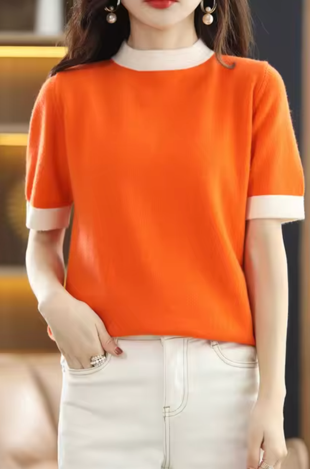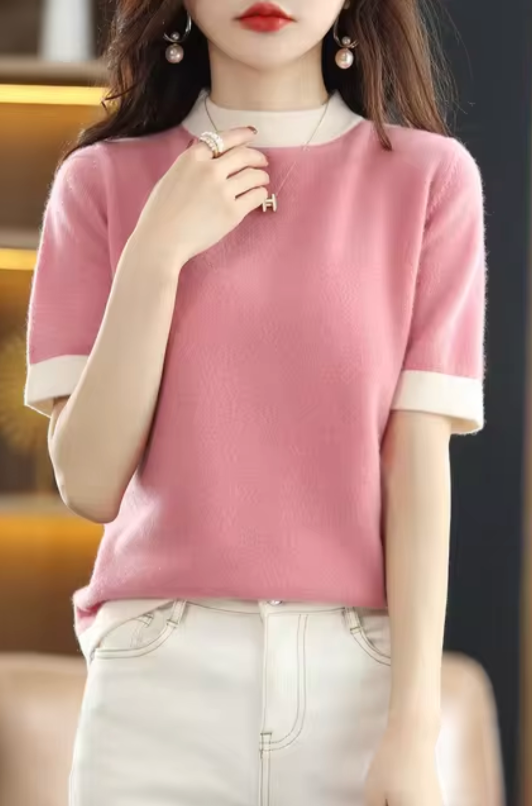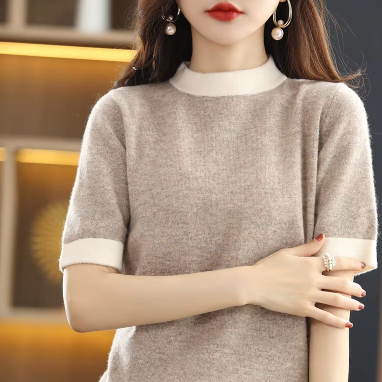 Este jersey de punto con medio cuello alto confeccionado en suave cachemira ofrece un lujoso confort y una calidez ligera, perfectos para la primavera y el verano. El diseño de manga cortay el corte holgado crean una silueta relajada pero sofisticada, por lo que es una opción ideal para conjuntos informales y relajados.